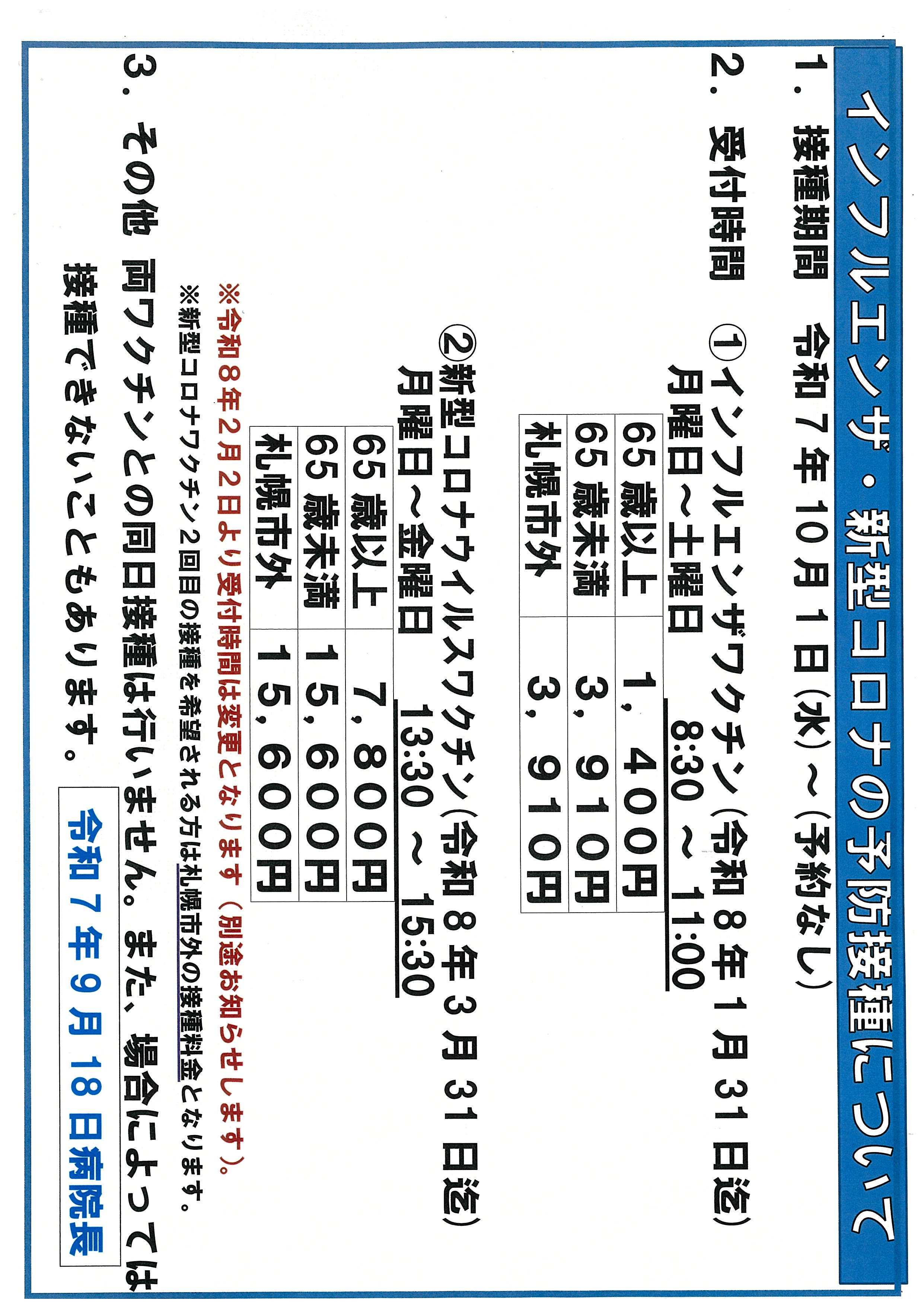 令和7年度インフルエンザ・新型コロナの予防接種を下記の通り実施いたします。