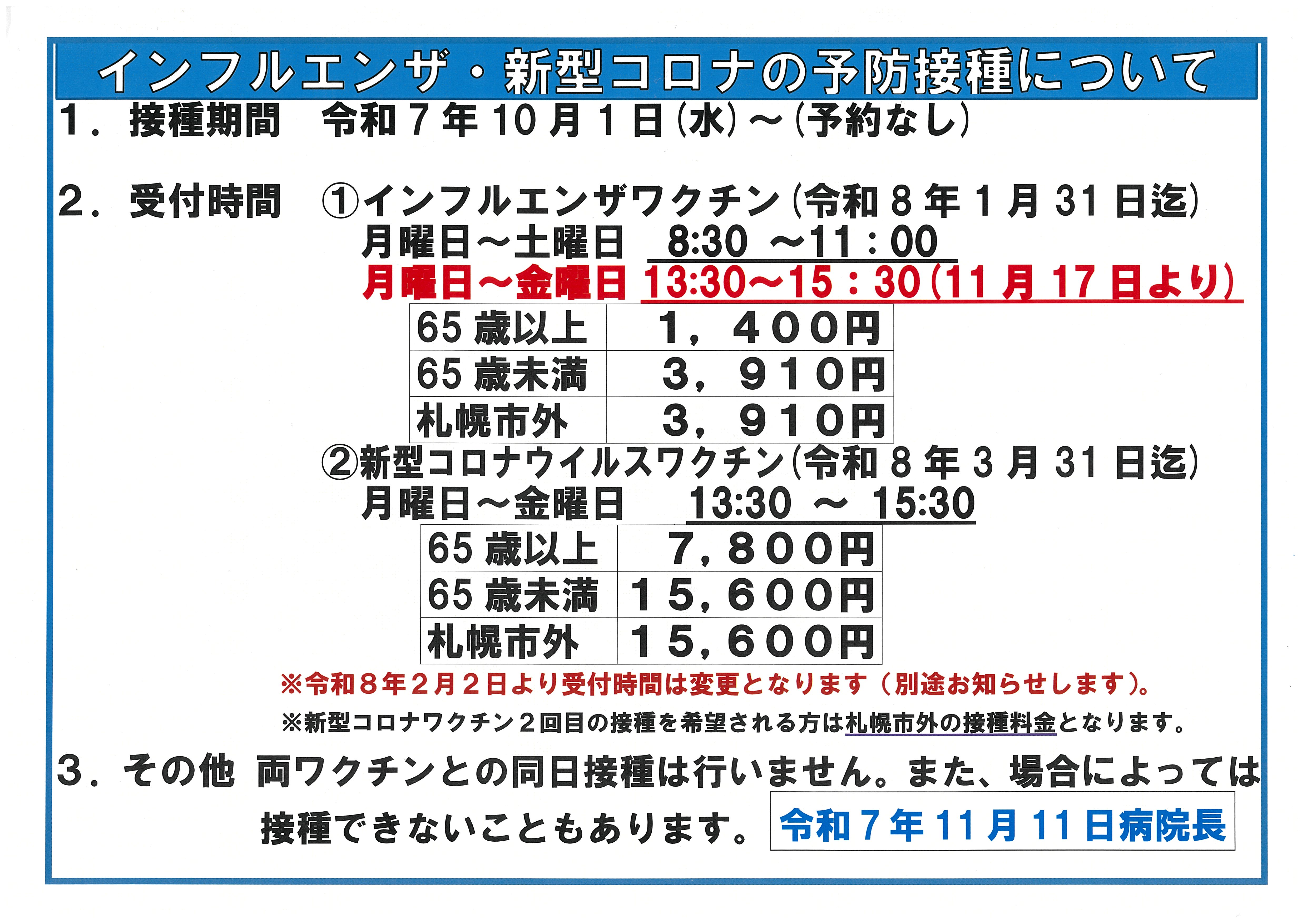 インフルエンザワクチンは午後からも接種可能となっておりますのでご利用ください。詳細は添付資料を参照願います。尚、新型コロナワクチンのヌバキソビット(武田)につきましては、原則2名で予約制とさせていただきます。コミナティ(ファイザー)につきましては、当日対応とさせていただきます。